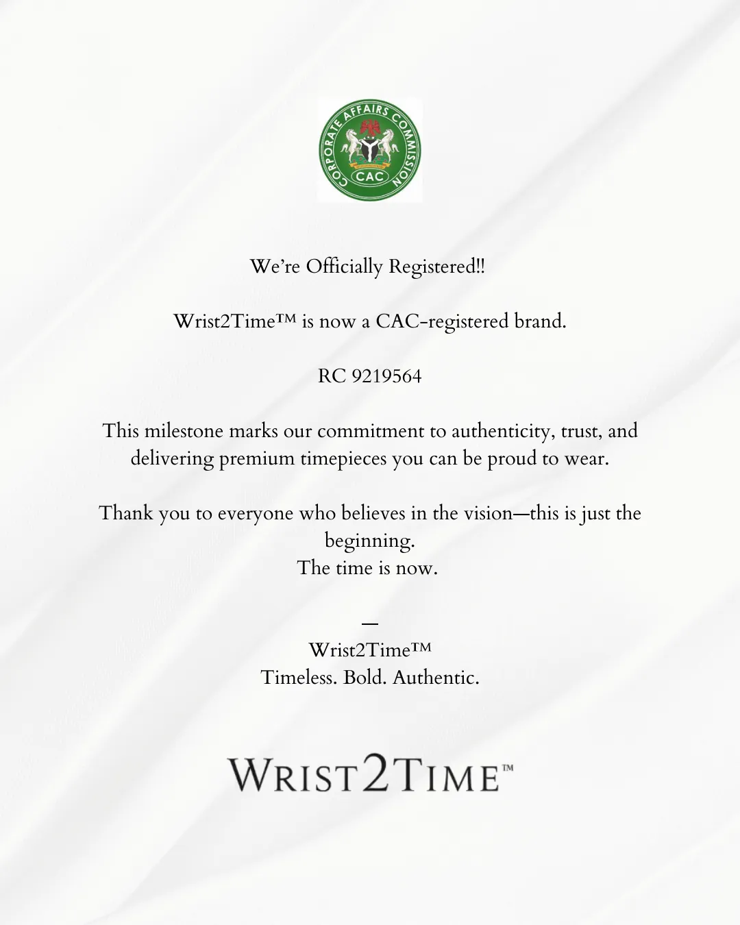 Wrist2Time™ Is a fully registered Nigerian Business. At Wrist2Time™, we curate watches that speak of distinction and timeless style. Each piece reflects craftsmanship, elegance, and quiet confidence. As a Nigerian-registered brand, we make owning a premium timepiece effortless, from secure PAYSTACK payment to careful delivery - so you can focus on making your mark.